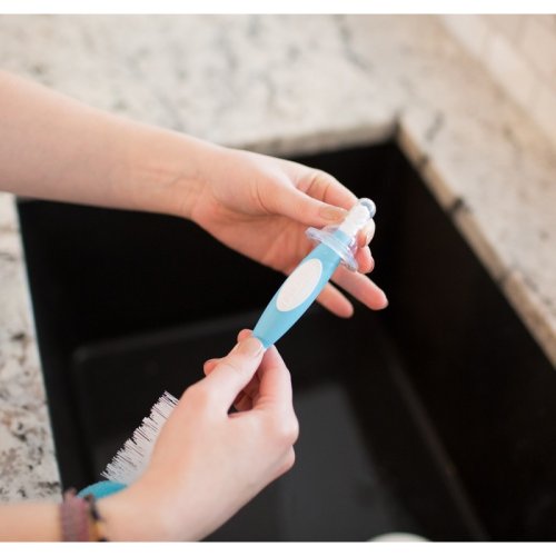 Jemný kartáč s houbičkou a měkkými odolnými štětinami na důkladné a snadné čištění, které nepoškrábou povrch. Tvarovaná protiskluzová rukojeť pro snadnou manipulaci a uchopení. Gumové drážkované ukončení rukojeti je určeno speciálně k čištění saviček. Stojan s přísavkou slouží k umístění kartáče v blízkosti dřezu nebo jako klip na uchycení. Vhodný i do sterilizátoru, bez BPA.