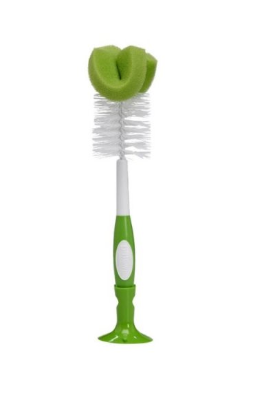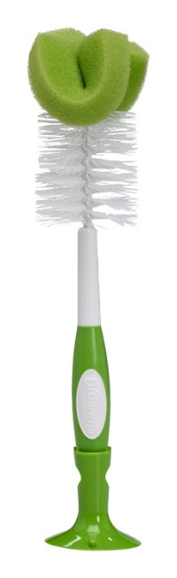 Jemný kartáč s houbičkou a měkkými odolnými štětinami na důkladné a snadné čištění, které nepoškrábou povrch. Tvarovaná protiskluzová rukojeť pro snadnou manipulaci a uchopení. Gumové drážkované ukončení rukojeti je určeno speciálně k čištění saviček. Stojan s přísavkou slouží k umístění kartáče v blízkosti dřezu nebo jako klip na uchycení. Vhodný i do sterilizátoru, bez BPA.