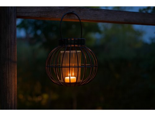 Elegantní černá kovová lampa s jemným drátěným designem nabízí stylové řešení osvětlení pro interiér i exteriér. Díky vnitřnímu skleněnému svícnu je bezpečná pro čajové nebo LED svíčky. Rozměry 19,5 × 15,3 cm a praktické ucho umožňují zavěšení na háček, větev nebo nosník. Lampa vytváří krásné světelné efekty a hodí se jak na večerní posezení venku, tak jako dekorační prvek do bytu.