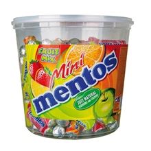 Dražé Mentos se žvýkací náplní (30 %) s ovocnou příchutí v praktickém balení vevelkokapacitní dóze Box obsahuje 120 minibalení po 10,5 g Mix různých ovocných příchutí