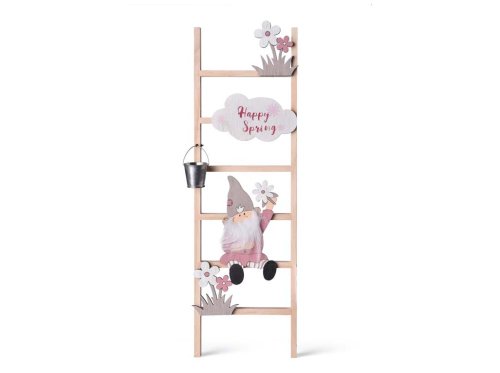 Dekorace ve tvaru žebříku s jarním skřítkem přinese do vašeho domova hravý a přírodní prvek. Vyrobeno ze dřeva s jemnými detaily, ideální pro stůl, polici nebo okno. Skvělé pro jarní výzdobu nebo tematické aranžmá.