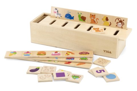 Dřevěná hra třídění. Pěkná a kvalitní krabička s 6 sloty na odnímatelném víku obsahuje 4 dlouhé desky a 48 ks dřevěných bloků s kategoriemi zeleniny, ovoce, dopravy, tvarů, zvířat a čísel. Položte jednu z desek na víko, najděte odpovídající obrázek a vložte jej do správného slotu. Rozměry cca 29,5 x 11,7 x 8,3 cm. Věk 3+