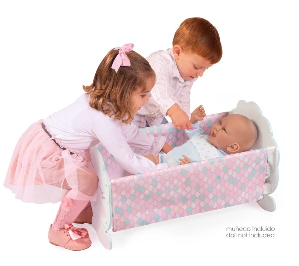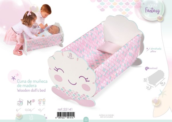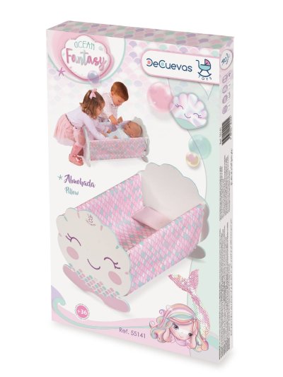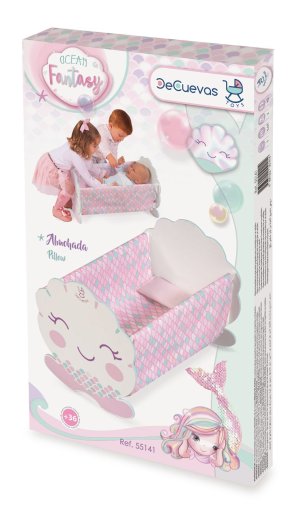 DeCuevas 55141 Dřevěná postýlky pro panenky s doplňky Ocean Fantasy 2021, z překrásné světle růžové kolekce s malou mořskou vílou, jistě zaujme svým designovým provedením, které je velmi nápadité. Obě čela kolébky jsou ve tvaru mořské mušle, který právě spinká. Díky svým jemným pastelovým barvám je tato kolébka krásným doplňkem dívčího pokojíčku.