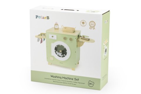 Dřevěná pračka s doplňky. Balení obsahuje pračku, lahvičku s tekutým práškem, košík na prádlo, kolíčky a několik kousků oblečení. Rozměry balení cca 47x47x17,5 cm. Rozměry výrobku 77,9x31,9x46,5 cm. Věk 3+