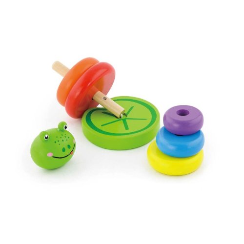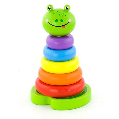 Dřevěná skládací pyramida žabka o rozměru cca 10 x 18 cm. Rozměry balení cca 20 x 12 x 12 cm. Věk 2+