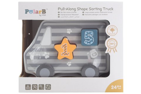Dřevěná tahačka a vkládačka ve tvaru nákladního auta. Rozměry cca 18 x 12 x 6,5 cm. Rozměry balení cca 19 x 16,5 x 13,5 cm. Věk 18m+