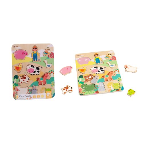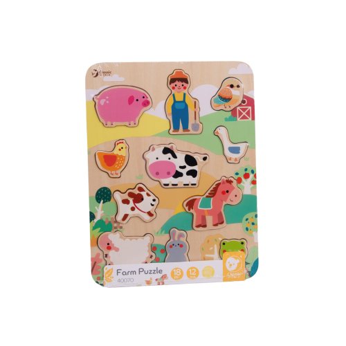 Objevuj svět zvířátek na farmě s krásnou dřevěnou vkládačkou! Barevně ilustrovaná deska a 12 veselých postaviček – od koníka a kravičky až po farmáře – pomáhá dětem rozvíjet jemnou motoriku, zrakové vnímání i logické myšlení. Každý dílek má pevné, zaoblené hrany a je uzpůsoben pro malé dětské ruce. Učení hrou začíná právě tady! Rozměr 21 x 30 cm Vhodné pro děti od 18 měsíců