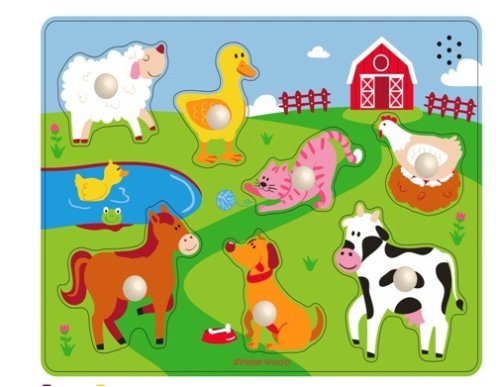 Krásně barevná dřevěná vkládačka – zvířata na farmě. Každé zvířátko zapadá pouze na své určené místo. Děti se při hře učí pojmenovávat zvířata – kravičku, ovečku, koníka a slepičku a další.Tato hrací deska procvičuje dětskou logiku a jemnou motoriku. Z kolekce dřevěné hračky od kvalitní značky Studo Wood.