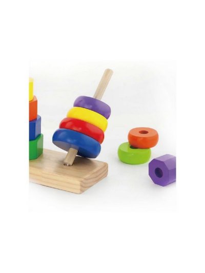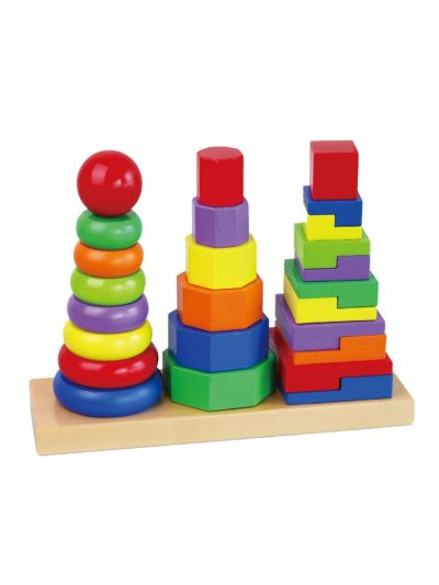 Barevné pyramidy Viga. Sada obsahuje 3 pyramidy, které jsou umístěny na dřevěném podstavci. Dítě musí umístit správný tvar na správné místo a ve správném pořadí, aby vytvořilo věž. Každá z nich má jiný geometrický podstavec. Hračka je vyrobena z lakovaného dřeva. Naší prioritou je bezpečnost a kvalita našich výrobků, a proto barvy použité na hračkách nejsou toxické a splňují bezpečnostní standardy (EN71 a ASTM). Pro děti od 12 měsíců.