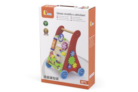 Dřevěné chodítko s herními prvky pro rozvíjení dětské chůze a motoriky, v české krabici. Rozměry cca 34 x 45,5 x 32 cm. Obsahuje různé provlékačky, bludiště a otáčecí hračky. Rozměry balení cca 31 x 47 x 11 cm. Věk 18m+