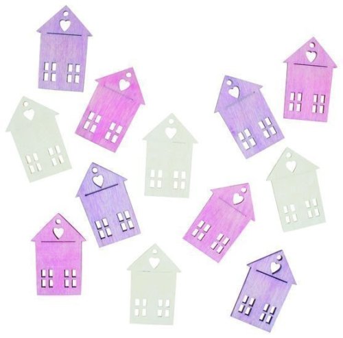 Dřevěné domečky v růžové, fialové a bílé barvě jsou určeny k vytváření dekorací.