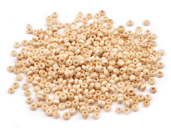 Drobné dřevěné korálky ve tvaru disku. Můžete je použít i tam, kde byste použili rokajl, pokud dáváte přednost přírodním tónům a dřevěnému materiálu. Rozměry 2 x 3 mm. Průvlek cca 1 mm. Korálky jsou lakované, [průvleky nemusí byt začištěné.] Varianta č. 3 a č. 4 jsou si barevně podobné, ale barva č. 4 je mírně tmavější. V balení 10 g je cca 1000 ks korálků.