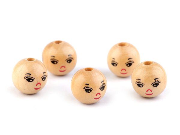 Dřevěné korálky s malovaným obličejem mají jemný lesk díky nalakování. S jejich pomocí si můžete vytvořit postavy andělíčků, uháčkovat panáčka, vytvořit veselý náhrdelník, vyrobit prstové maňásky, veselé zápichy do květináče apod. Díky malbě se od sebe jednotlivé korálky mohou lišit. Může se lišit i kresba dřeva, včetně barvy. Vzhledem k technologii zpracování dřeva mohou být okolo průvleků otřepky. Výrobek není vhodný pro děti do 3 let.