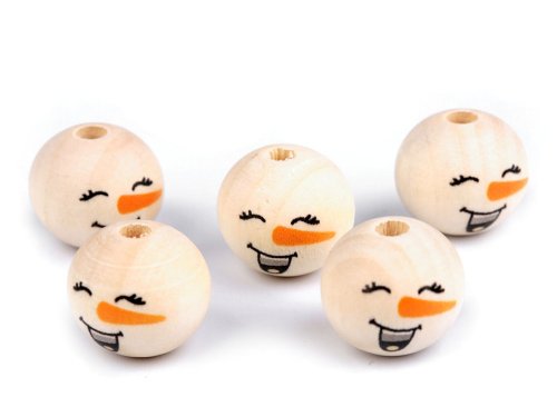 Dřevěné korálky s malovaným obličejem sněhuláka. S jejich pomocí si můžete vytvořit postavičky, vytvořit veselý náhrdelník, vyrobit prstové maňásky, veselé zápichy do květináče apod. Díky malbě se od sebe jednotlivé korálky mohou lišit. Může se lišit i kresba dřeva, včetně barvy. Vzhledem k technologii zpracování dřeva mohou být okolo průvleků otřepky. Obličej je na přední straně korálku, zadní strana je bez malby. Korálky č.1 a 3 se díky laku jemně lesknou, korálky č.2 a 4 jsou přírodní.