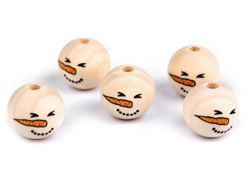 Dřevěné korálky s malovaným obličejem sněhuláka. S jejich pomocí si můžete vytvořit postavičky, vytvořit veselý náhrdelník, vyrobit prstové maňásky, veselé zápichy do květináče apod. Díky malbě se od sebe jednotlivé korálky mohou lišit. Může se lišit i kresba dřeva, včetně barvy. Vzhledem k technologii zpracování dřeva mohou být okolo průvleků otřepky. Obličej je na přední straně korálku, zadní strana je bez malby. Korálky č.1 a 3 se díky laku jemně lesknou, korálky č.2 a 4 jsou přírodní.