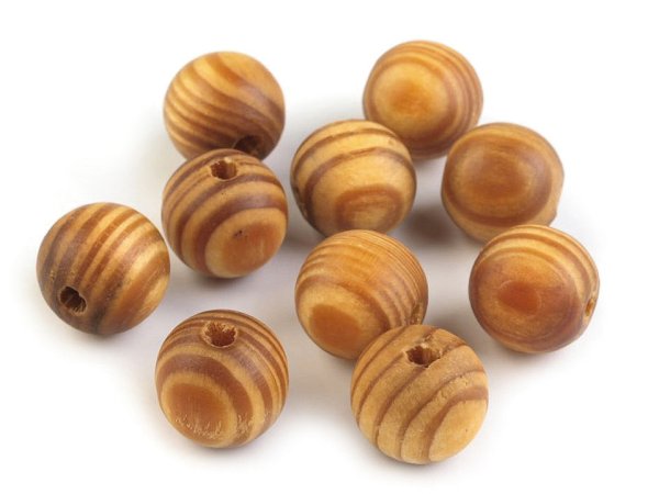 Dřevěné korálky s výraznou kresbou dřeva jsou lakované. [Jsou vyrobené z borovice.] Díky použitému materiálu jsou velmi lehké a příjemné na nošení. Korálky jsou vhodné i pro kombinaci s pedigem, mořskou trávou a jinými dekoračními materiály.