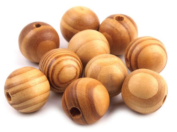 Dřevěné korálky s výraznou kresbou dřeva. [Jsou vyrobené z borovice.] Korálky nejsou lakované, ale napuštěné speciální lazurou, aby struktura dřeva ještě více vynikla. Průvlek cca 4 mm.