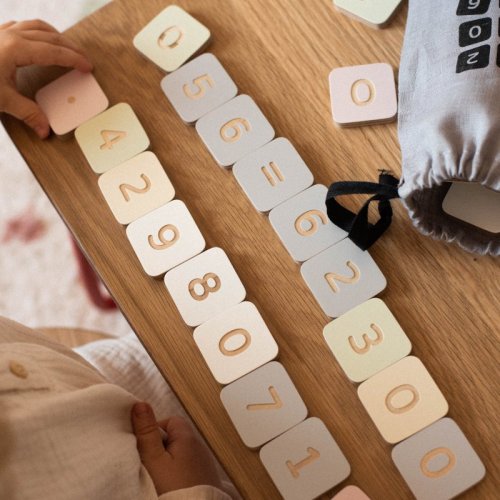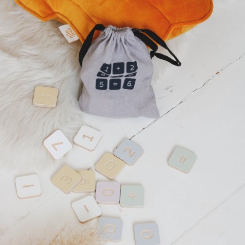 • krásná sada kvalitních, dřevěných kostiček s číslicemi a matematickými znaky