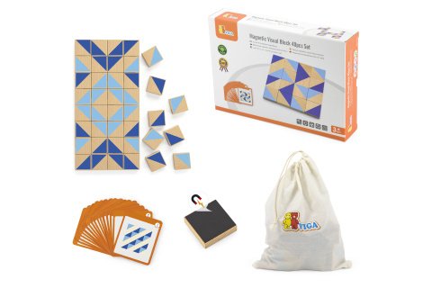 Dřevěné magnetické tangramy. Balení obsahuje celkem 40 kusů magnetických tvarů, kartičky (dle kterých lze skládat obrázky) a praktický látkový pytlík pro snadné skladování. Rozměry balení cca 26 x 18 x 5 cm. Věk 3+