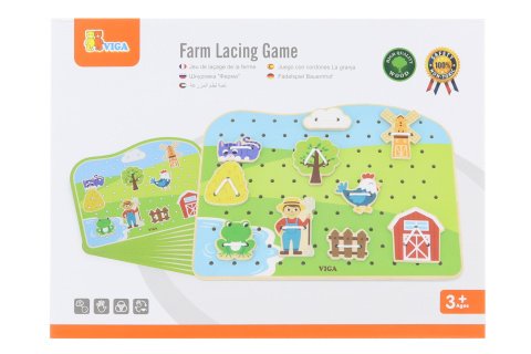 Tato navlékací hračka s motivem farmy obsahuje dřevěnou hrací desku, 20 navlékacích destiček, 3 nitě a 10 karet se šablonami, které ukazují různé způsoby navlékání doplňků na desku. Děti mohou také vytvářet neomezené scény prostřednictvím své fantazie. Pomáhá trénovat jemnou motoriku, schopnost rozpoznávání tvarů, prostorovou orientaci a koordinaci oko-ruka. rozměr hrací desky cca 30,5 x 22,6 x 4 cm. Rozměr balení cca 30,5 x 22,5 x 4 cm. Věk 3+