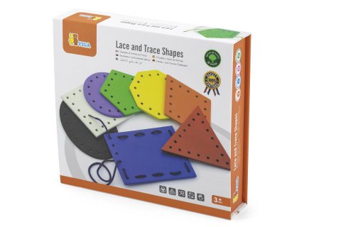 Dřevěné provlékání tvarů. Balení obsahuje 8 destiček s tvary a tkaničky. Rozměry balení cca 20,5x19x4,5 cm. Věk 3+