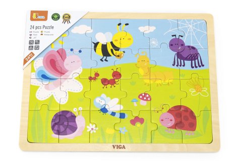 Veselé dřevěné puzzle s motivem lučních zvířátek. Obsahuje 24 dílků. Rozměry desky cca 30x22x1 cm. Velikost 1 dílku cca 5 cm. Věk 2+