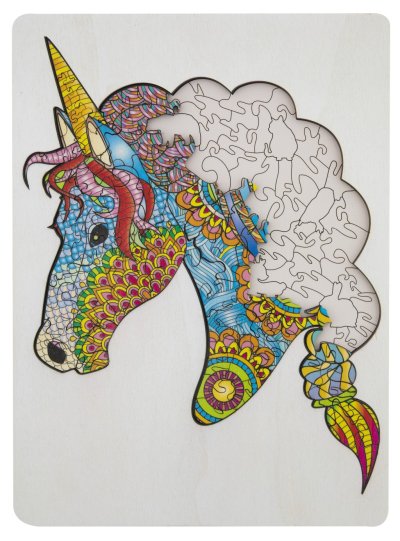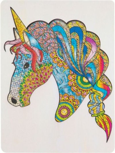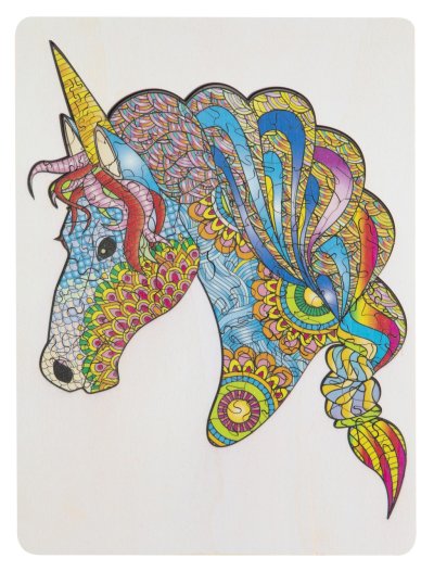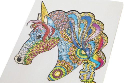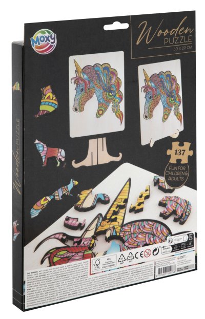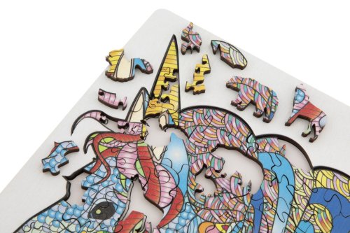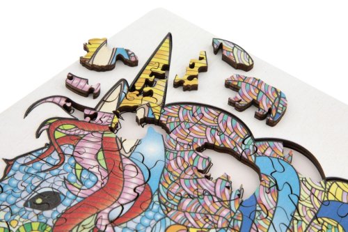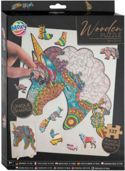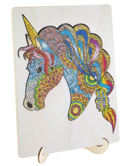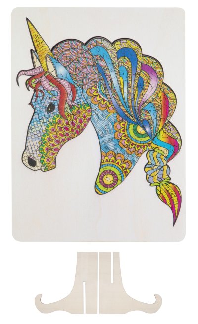 Dřevěné mozaikové puzzle se stojánkem v designu Jednorožec. Puzzle se skládají ze 132 jedinečně tvarovaných dílků a složené puzzle lze poté umístit na přiložený dřevěný stojan. Rozměry: 30 × 22 centimetrů. Vhodné od 7 let.