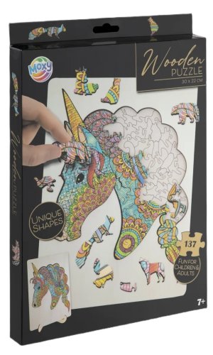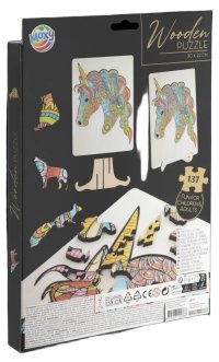 Úžasné puzzle s jedinečnými dřevěnými dílky o velikosti 30x22 cm, každý dílek je unikátní a je ve tvaru různých zvířátek, dílky se skládají do destičky, po složení vznikne z malých zvířátek/dílků obraz jednoho velkého, součástí balení je také praktický stojánek, aby bylo možné dokončenou skládačku patřičně vystavit. Zábava pro děti i dospělé.