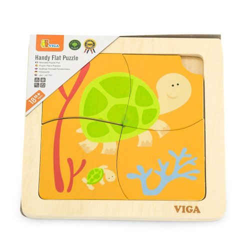 Dřevěné puzzle želva, obrázek o rozměru cca 12 x 12 cm. Rozměry balení cca 15 x 15 x 1 cm. Věk 12m+