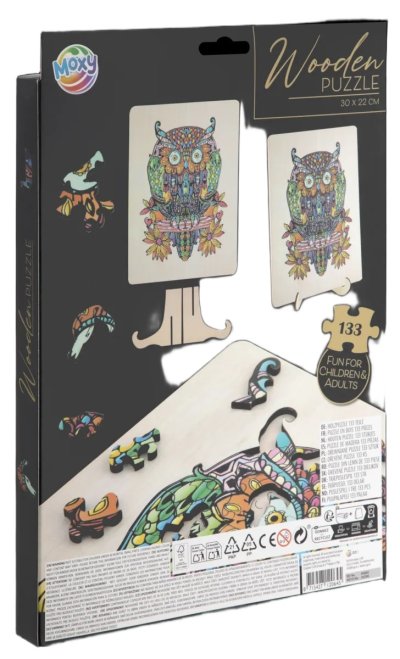 Úžasné puzzle s jedinečnými dřevěnými dílky o velikosti 30x22 cm, každý dílek je unikátní a je ve tvaru různých zvířátek, dílky se skládají do destičky, po složení vznikne z malých zvířátek/dílků obraz jednoho velkého, součástí balení je také praktický stojánek, aby bylo možné dokončenou skládačku patřičně vystavit. Zábava pro děti i dospělé.