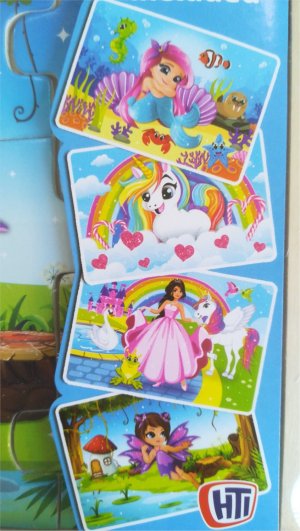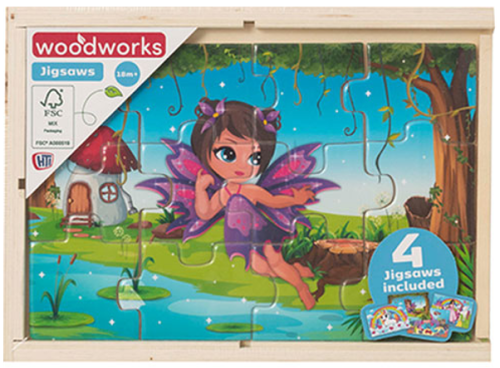 Čtyři samostatné dřevěné puzzle po 12 dílcích v dřevěné krabičce s víkem. Víko slouží zároveň jako podložka na skládání. Rozměr složeného puzzle cca 17 x 11,5 cm