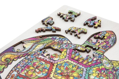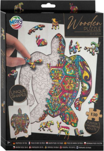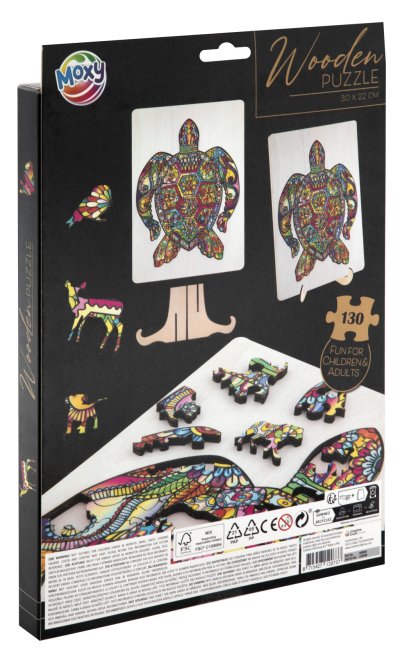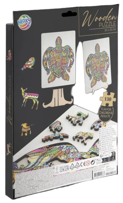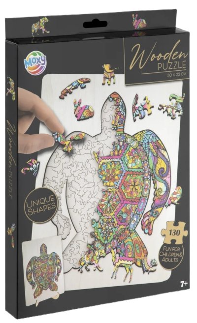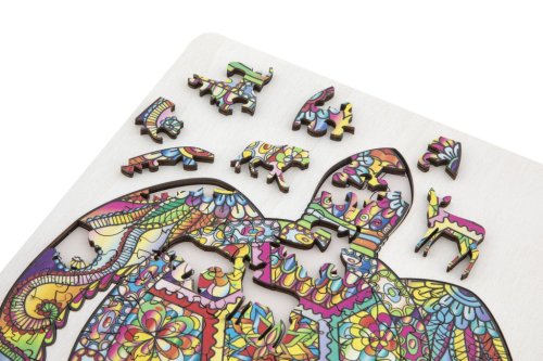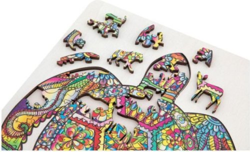 Úžasné puzzle s jedinečnými dřevěnými dílky o velikosti 30x22 cm, každý dílek je unikátní a je ve tvaru různých zvířátek, dílky se skládají do destičky, po složení vznikne z malých zvířátek/dílků obraz jednoho velkého, součástí balení je také praktický stojánek, aby bylo možné dokončenou skládačku patřičně vystavit. Zábava pro děti i dospělé.