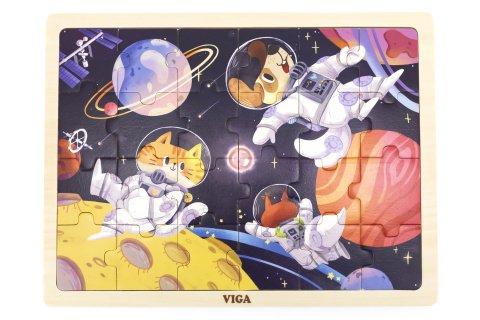 Dřevěné puzzle s obrázkem zvířátek ve vesmíru. Celkem 24 dílků. Rozměry obrázku cca 27,5 x 20 cm. Rozměry balení cca 30 x 27 x 1 cm. Věk 24m+