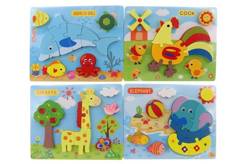 Puzzle-vkládačka pro nejmenší děti s motivem zvířátek. Materiál dřevo. Více druhů (delfín, kohout, žirafa, slon) - dodáváme dla skladové dostupnosti. Rozměry balení cca 22x18x1 cm. Věk 12m+