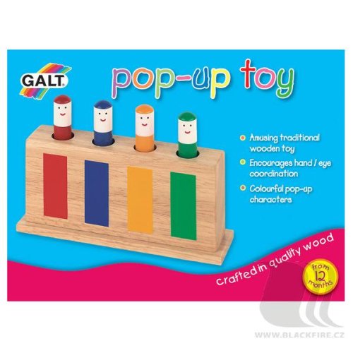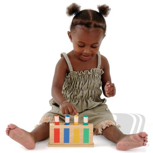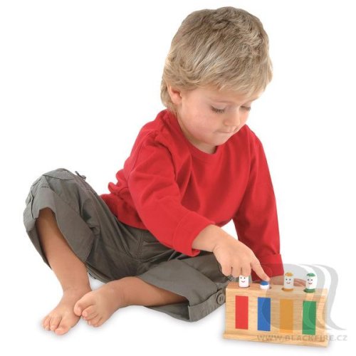 Zábavná dřevěná dětská hračka obsahuje 4 kolíčky (figurky), které díky pružince po zatlačení vyskočí. Vhodné pro zdokonalení zrakové a hmatové koordinace a vnímání kombinace barev. Vhodné pro děti od 12 měsíců.