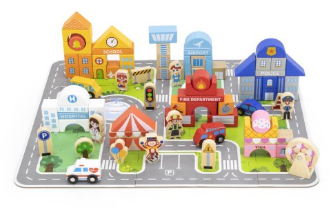 Dřevěná stavebnice obsahuje 80 kostek k postavení městečka a 20 dílků puzzle k postavení podložky z tvrdého kartonu. Velikost podložky cca 55 cm.Vše zabaleno v praktickém kyblíku. Rozměry kyblíku 22x22x25 cm. Věk 2+