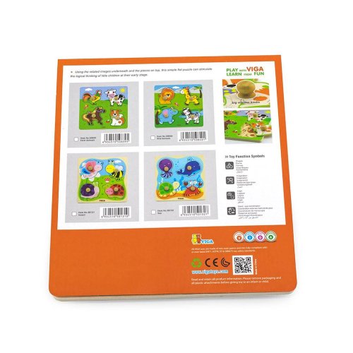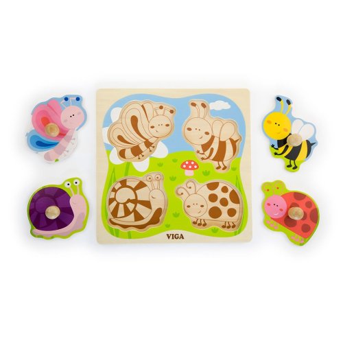Toto krásné puzzle s obrázky různého hmyzu je jednoduchá plochá skládačka. Dílky skládačky jsou opatřeny dřevěnými kolíčky, díky nimž batole snadno uchopí skládačku do ruky a umístí ji na správné místo na dřevěném podkladu.