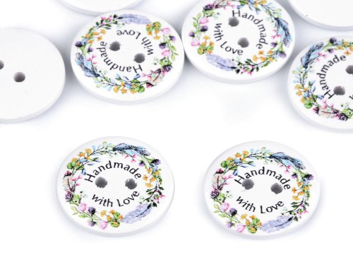 Dřevěné dekorační knoflíky zdobí nápis "Made with love" [a "Handmade with love".] Vyniknou na ručních výrobcích, dárcích a různých dekoracích. Můžete je použít také ve scrapbookingu. Motiv je jednostranný.