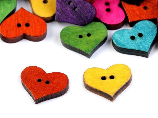 Dřevěné knoflíky ve tvaru srdce udělají radost hlavně zamilovaným či milovaným lidem. Využijete je ve scrapbookingu, kde s nimi můžete ozdobit rámečky, přáníčka, jmenovky, pozvánky, deníky apod. Lze je použít i do květinových vazeb, které se tím krásně oživí. Knoflíky jsou baleny v sáčku. Velikost knoflíků naleznete v této tabulce.Při styku s vodou pouští barvu, proto je nedoporučujeme prát.