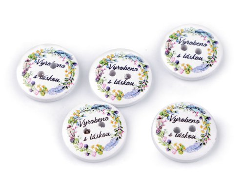 Dřevěné dekorační knoflíky zdobí květinový potisk a nápis "Vyrobeno s láskou". Vyniknou na ručních výrobcích, dárcích a různých dekoracích. Můžete je použít také ve scrapbookingu. Motiv je jednostranný.