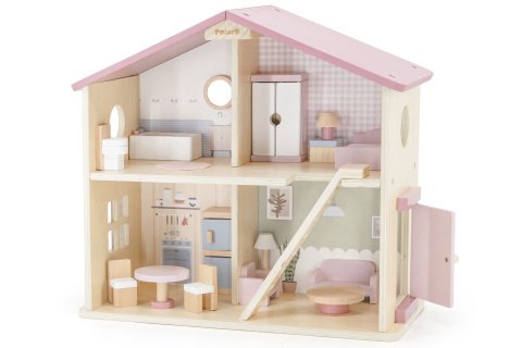 Dřevěný domeček pro panenky. Domeček se skládá z kuchyně, obývacího pokoje, koupelny a ložnice. Součástí balení je 16 drobných doplňků. Rozměry domečku 40,5x19,5x38 cm. Rozměry balení 42x40x21 cm. Věk 3+
