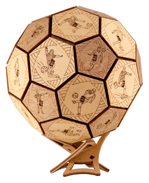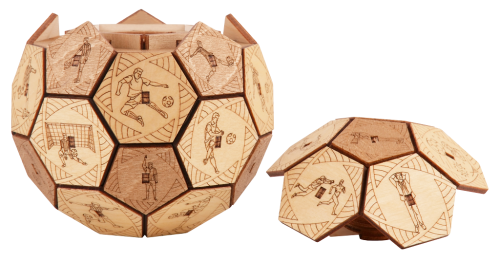 Už žádný nudný balící papír! Emoce jsou nejlepší dárek... Hledáte vhodný dárek pro fotbalové nadšence? Pak věnujte tento dárek s překvapením a zažijte strhující zábavu díky Quest Ball skládačce. Chcete najít tajemství ukryté v tajné vnitřní schránce? Sdílejte s přáteli zábavné okamžiky a soutěžte v odhalování mechanismu. Kdo první odhalí tajemství? Prokažte svou vynalézavost a vyřešte otevírací mechanismus. Věnujte dárek s překvapením, anebo skryjte svá vlastní tajemství díky tomuto dřevěnému míči s hlavolamem. Quest Ball v jedinečném designu je dokonalý pro uložení věcí, které jsou vašemu srdci drahé. Elegantní tvar jej proměňuje v umělecké dílo, které bude ozdobou interiéru nejen fotbalových fanoušků. Vyroben byl šetrně k životnímu prostředí, ze 100% přírodních materiálů a všechny jeho části byly přesně vyřezány nejlepší laserovou technologií. Splňuje všechny evropské bezpečnostní normy. Věk: 14+ Materiál: dřevo