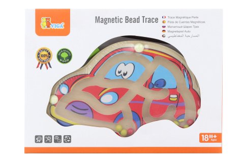 Dřevěný magnetický labyrint s kuličkami ve tvaru auta. Rozměry cca 18,5 x 11 cm. Rozměry balení cca 22,5 x 16,5 x 4 cm. Věk 18m+