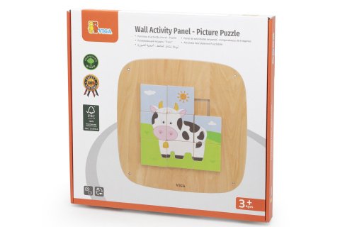 Dřevěný nástěnný panel se skládačkou kravičky. Rozměry panelu 40x40x3 cm. Baleno v krabici. Rozměry balení 41x41x4 cm. Věk 3+