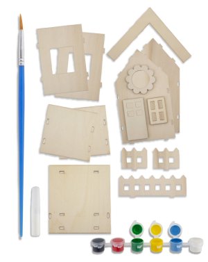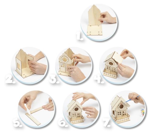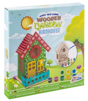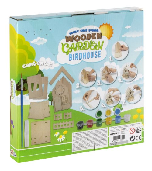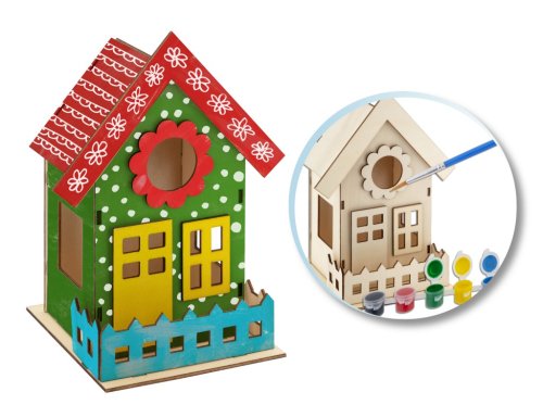 Dřevěný zahradní ptačí domeček 3D – sestav si svůj vlastní domeček a vymaluj ho přiloženými barvami. Balení obsahuje dřevěný domeček, 6 barev, lepidlo a štětec.