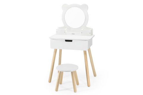 Tento dřevěný toaletní stolek se stoličkou je vybavený velkým šuplíkem, který poskytuje spoustu úložných prostor. Stolek je ideálním prostředkem, kde si děti mohou hrát se šperky, vlasovými doplňky a dětským make-upem.Stylový design z něj dělá ideální doplněk do každé herny nebo dětského pokoje. Součástí balení není příslušenství - lze dokoupit zvlášť (442032 nebo 505318). Rozměry balení cca 37,5x50x16 cm. Rozměry stolku 48x27,5x84. Rozměry stoličky 29,8x29,8x23 cm. Věk 3+