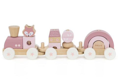 Dřevěný vláček růžový s motivem lišky. Sada se skláda z mašinky, 2 vagonků a 13 kostek různých tvarů a velikostí. Rozměry vláčku 33x7,3x9,5 cm. Rozměry balení 37,5x12,5x8 cm. Věk 18m+