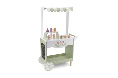 Velká dřevěná pojízdná prodejna zmrzlin. Balení obsahuje dřevěnou prodejnu, dřevěné zmrzliny, dřevěné nanuky, dřevěné kornoutky, dřevěné kleště na nabírání zmrzliny, dřevěnou lahvičku s toppingem a kreslící tabuli. Rozměry 63x30x104 cm. Rozměry balení cca 66x32x10 cm. Věk 3+