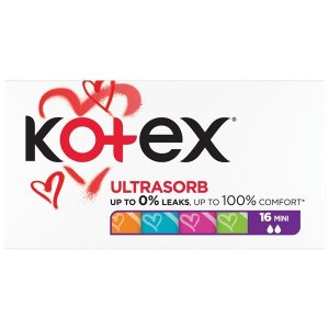 KOTEX® Ultra Sorb Mini – komfortní tampóny pro lehkou menstruaci Speciálně navržené modré absorpční jádro pro vyšší spolehlivost Zaoblená špička a hedvábně hladký povrch pro snadnější zavádění Vysoce …