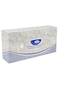 Dvouvrstvé bílé papírové kapesníčky v kartonovém boxu s okénkem pro snadné vytahování. Materiál –100 % ní celulóza, extra bílá.